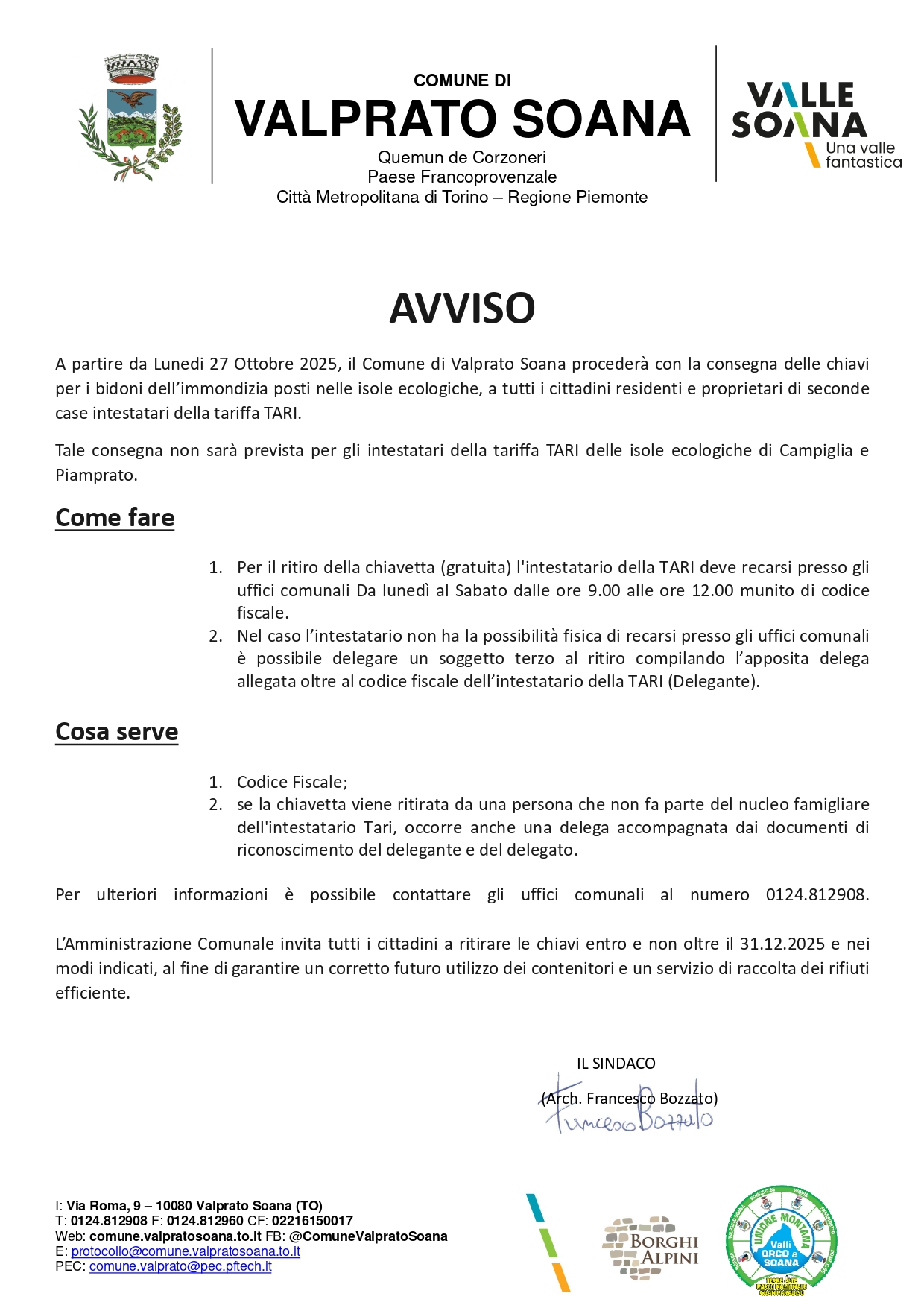 A partire da lunedì 27 ottobre 2025, il Comune di Valprato Soana procederà con la consegna delle chiavi per i bidoni dell’immondizia ai cittadini interessati.