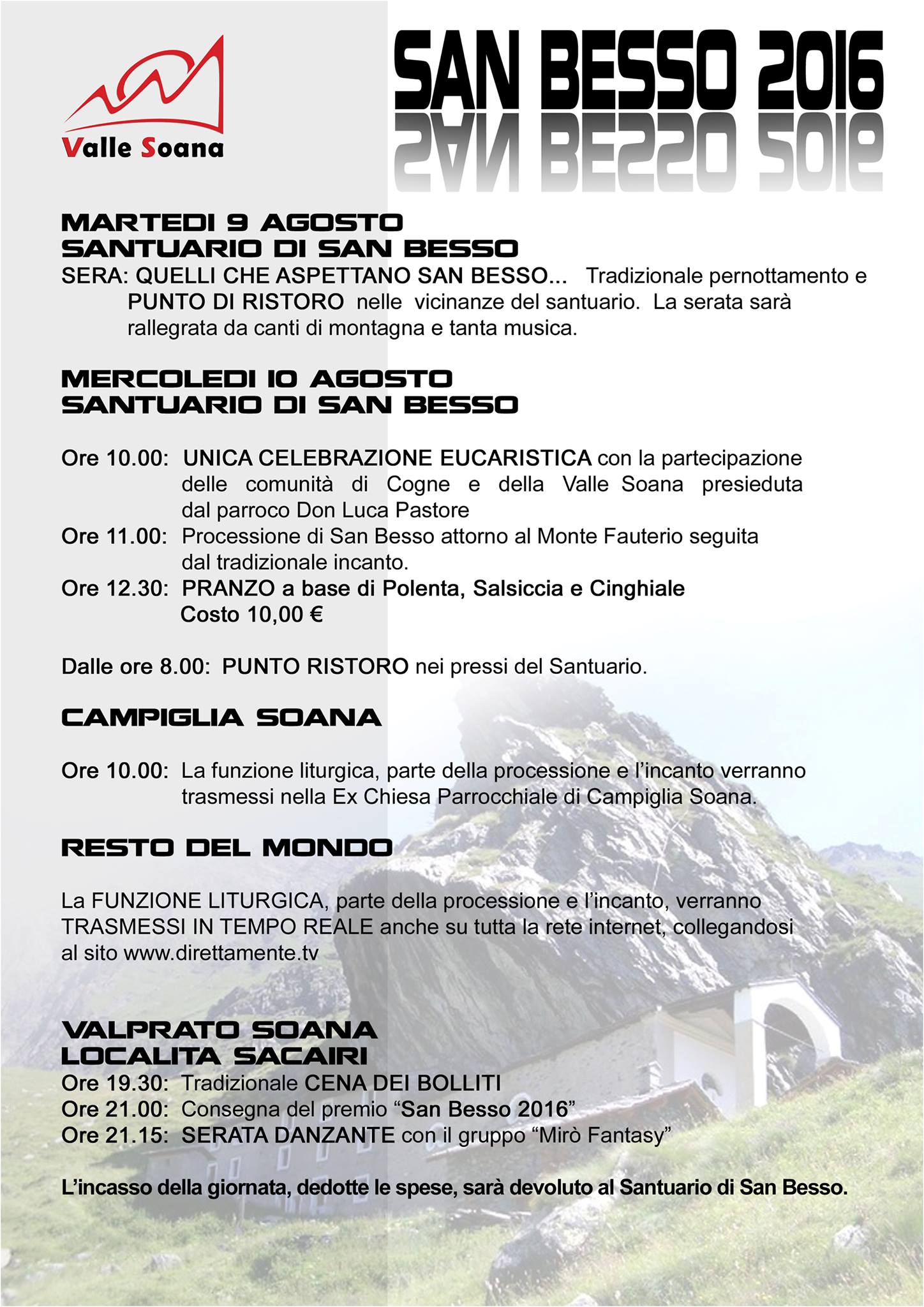 La funzione liturgica e l'incanto saranno trasmessi in tempo reali a partirà alle 9.45 di mercoledì 10 agosto 2016 dal sito internet www.direttamente.tv